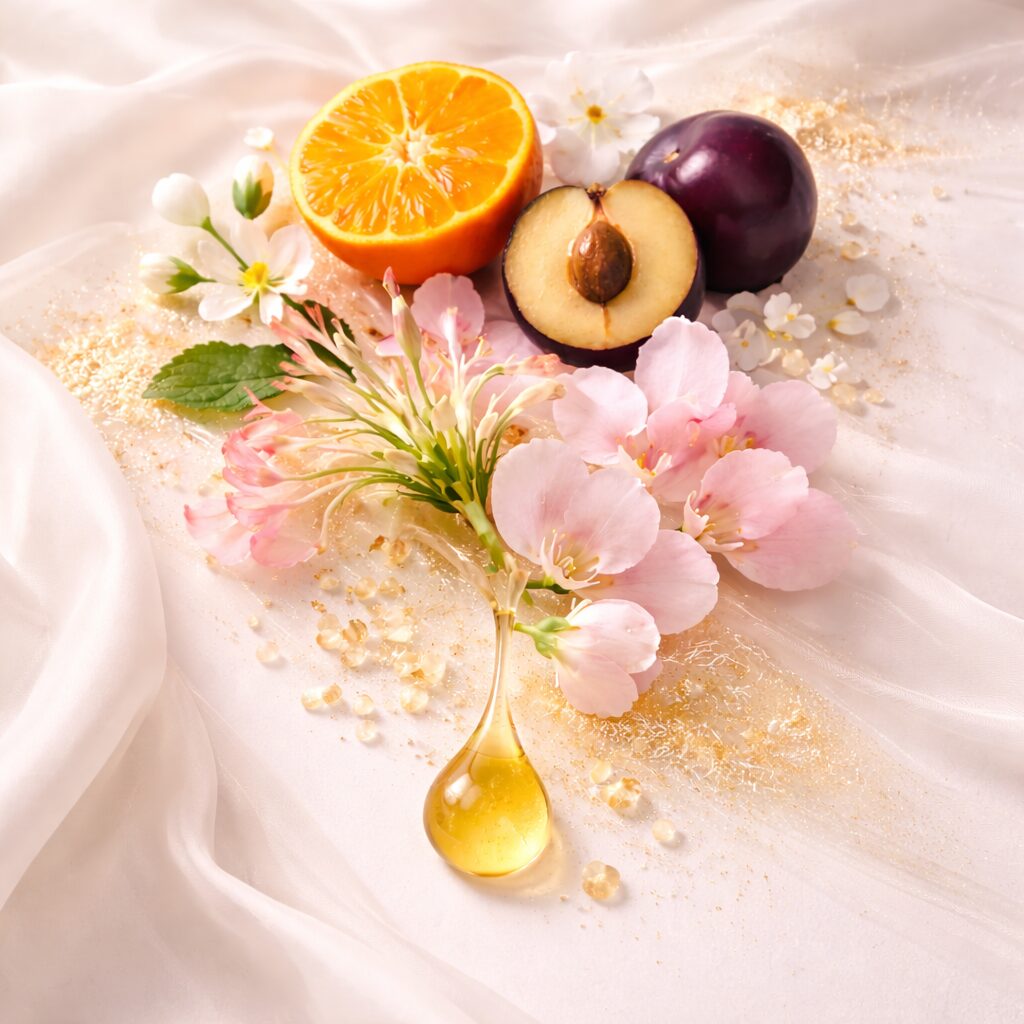 Zmysłowa, kobieca kompozycja o owocowo-kwiatowym charakterze. Zapach otwiera się soczystymi nutami mandarynki i dojrzałej śliwki, przełamanymi świeżością neroli. W sercu rozkwita romantyczne połączenie wiciokrzewu i słodkiego groszku, podkreślające delikatność i elegancję. Całość dopełnia miękka baza labdanum, nadająca kompozycji ciepły, harmonijny i subtelnie zmysłowy charakter.