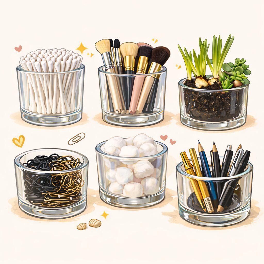 Pojemnik po świecy może posłużyć jako niewielka doniczka na roślinę. Wsyp do niego odpowiednią ilość ziemi i posadź niewielką roślinkę. Wykorzystaj pojemnik do przechowywania drobnych przedmiotów, dzięki temu utrzymasz porządek na biurku lub w szufladzie.