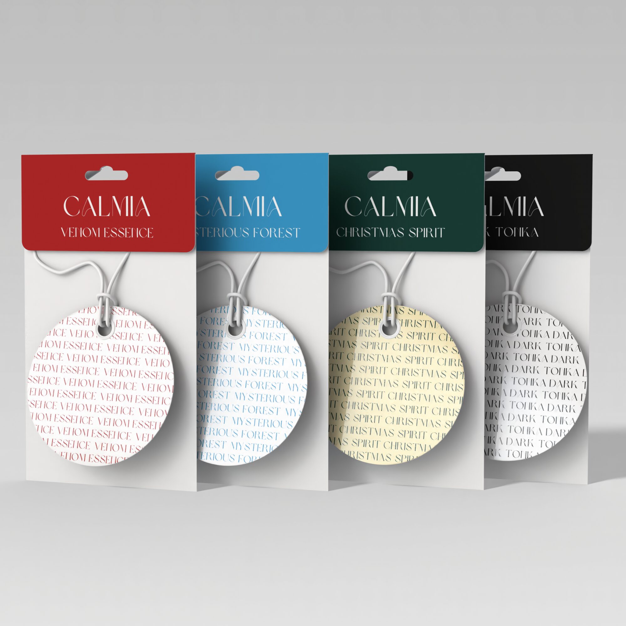 Zestaw zawiera po 1 zawieszce zapachowej z każdego zapachu: Venom Essence, Mysterious Forest, Christmas Spirit oraz Dark Tonka.
