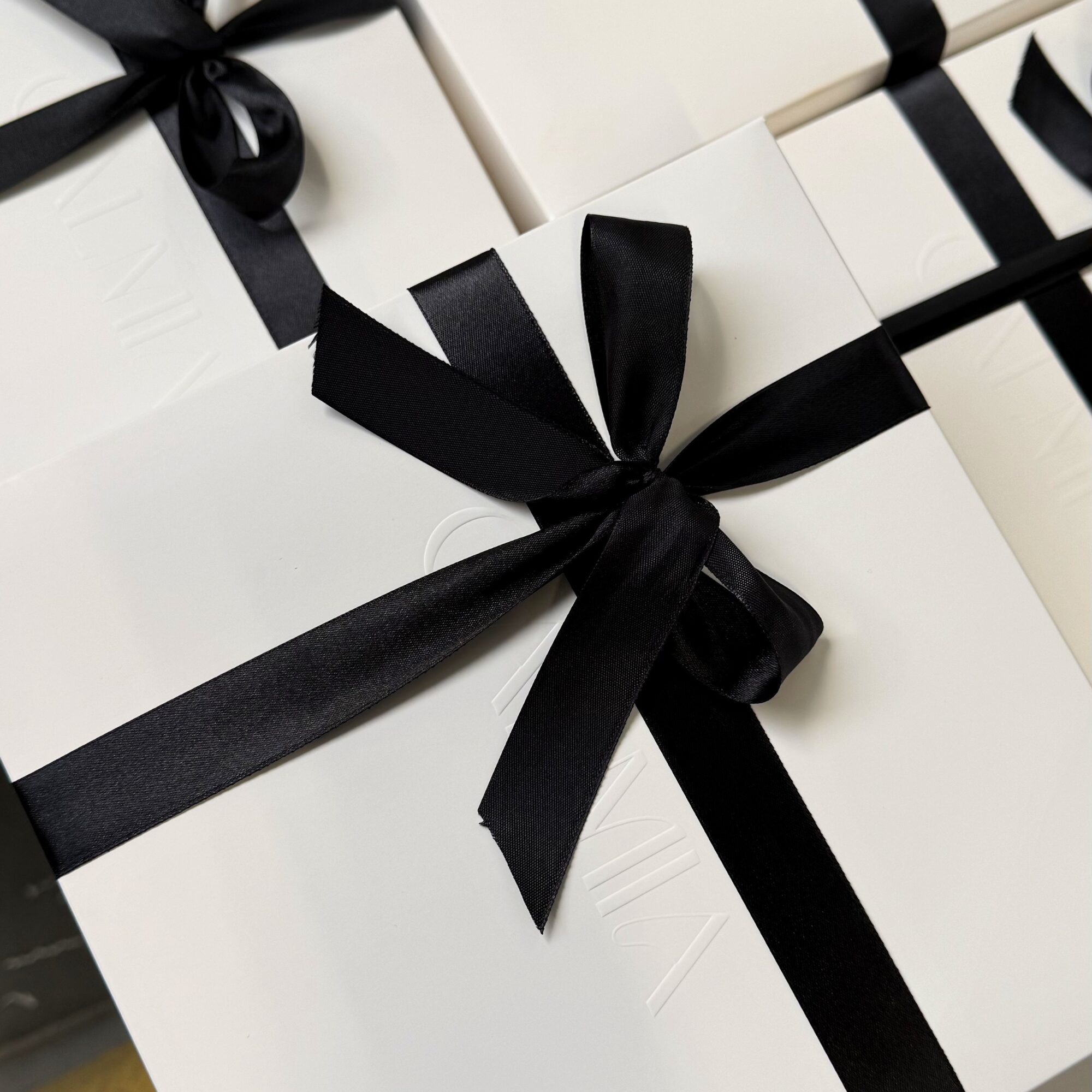 Eleganckie pudełko przewiązane wstążką, gotowe do wręczenia jako prezent.