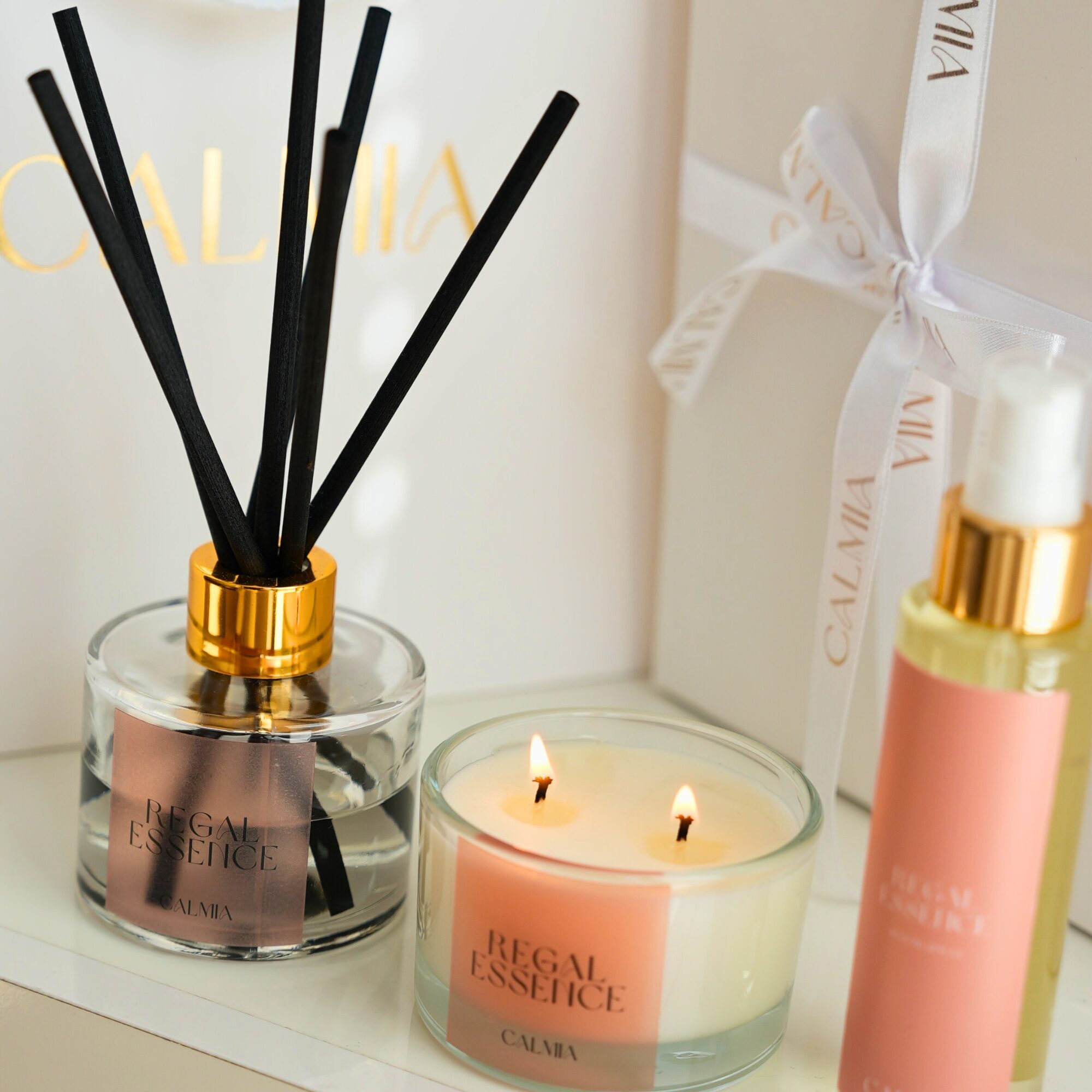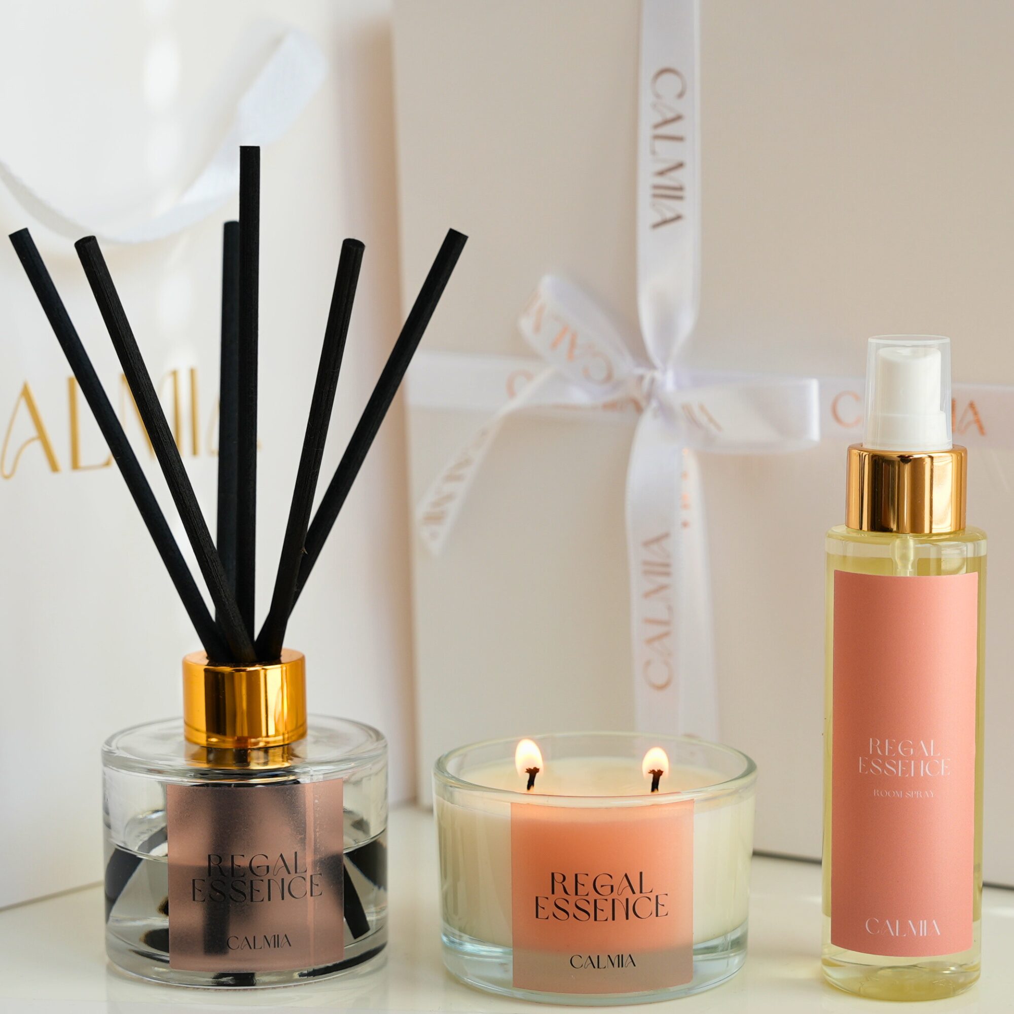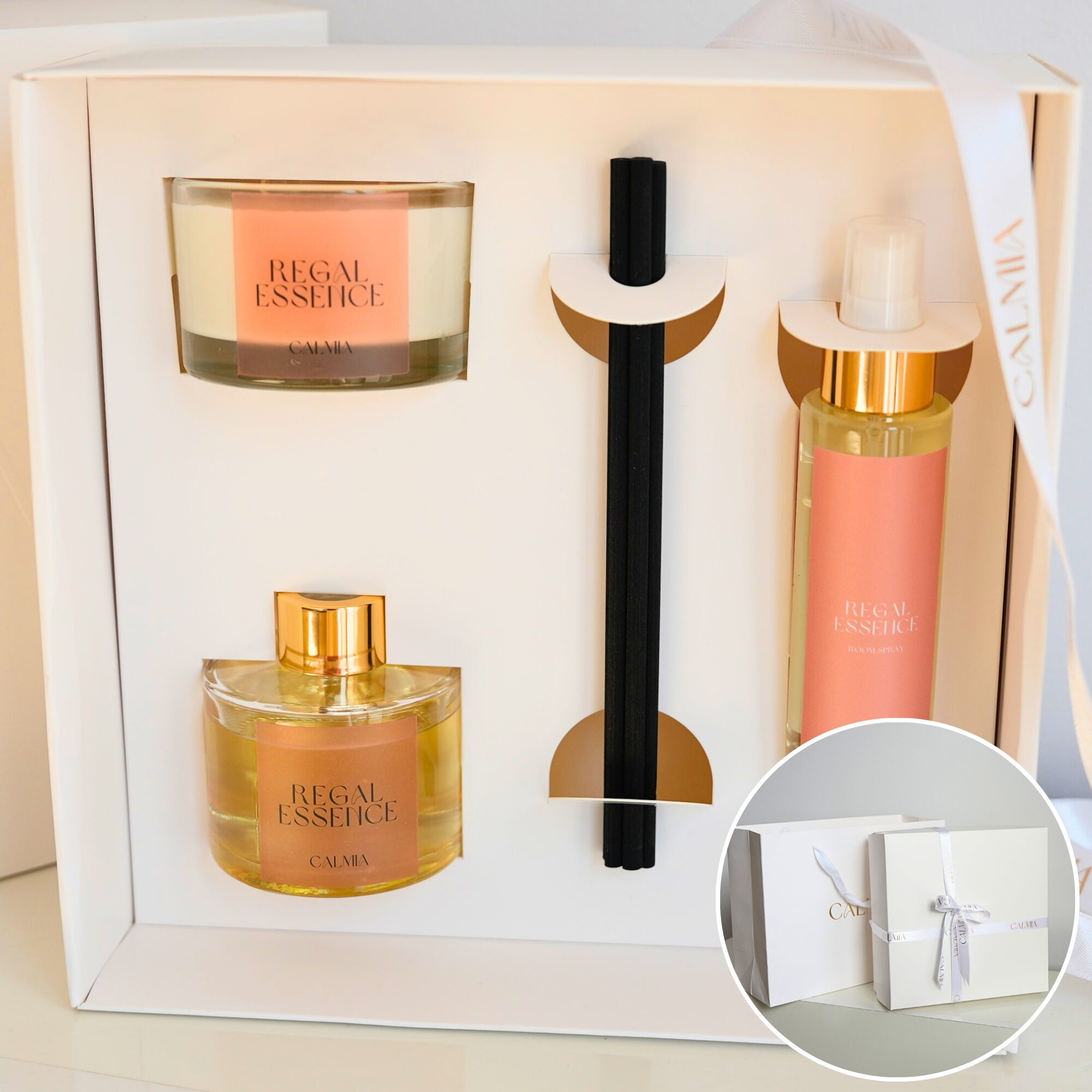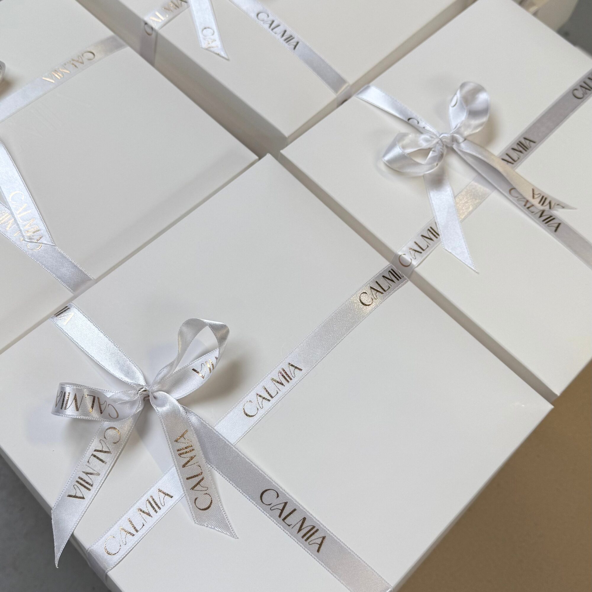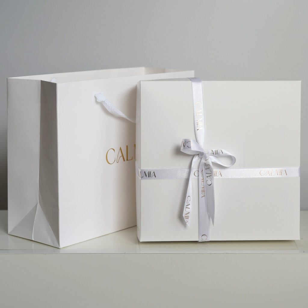 Zestaw zapakowany jest w minimalistycznym pudełku prezentowym, przewiązanym wstążką z tłoczonym na złoto logo Calmia. Do kompletu dołączamy dopasowaną torbę prezentową z tym samym złotym akcentem – to idealny upominek, który zachwyca od pierwszej chwili.
